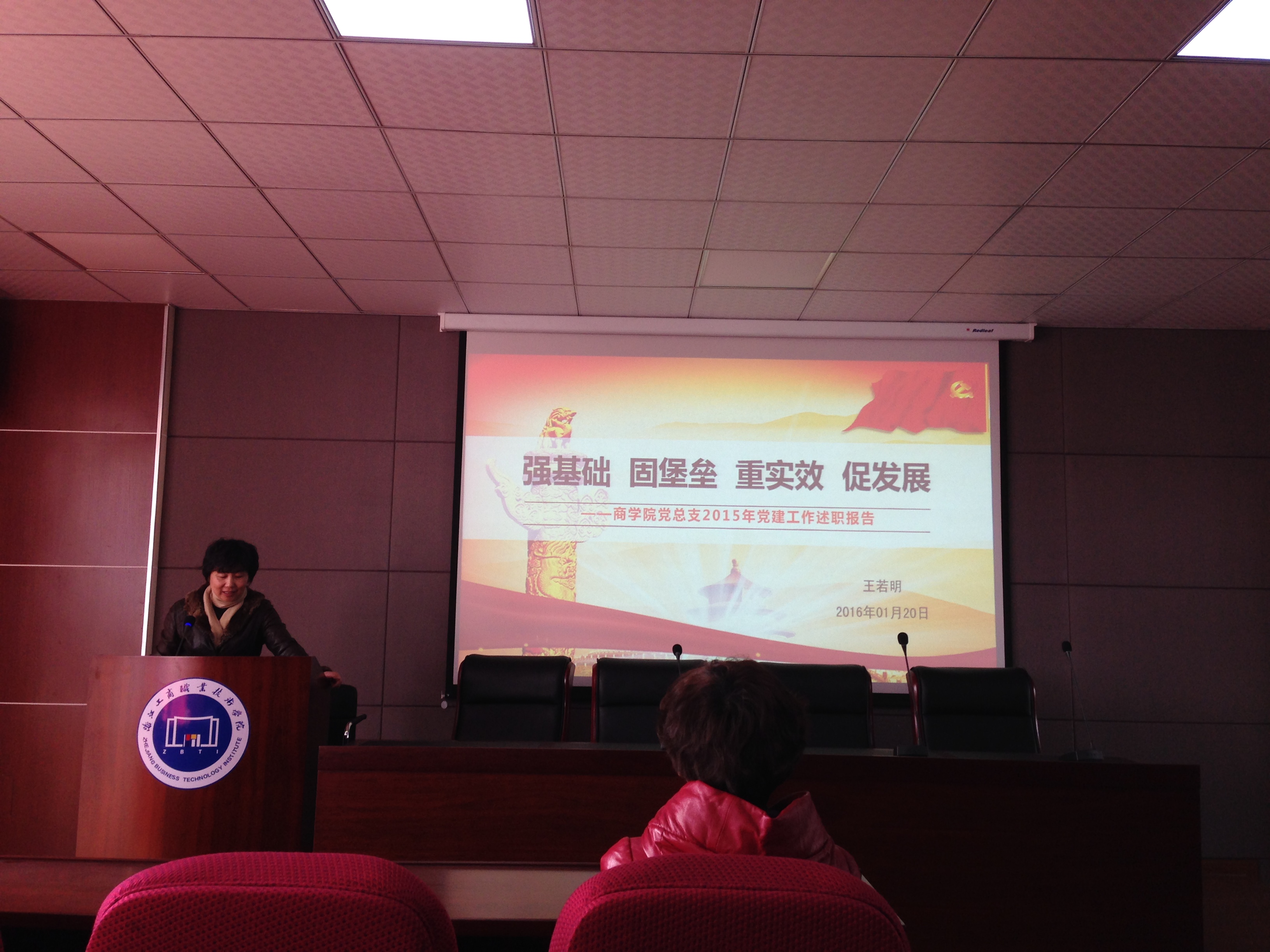 2016年2月24日上午9:30,商公司党总支在25C3报告厅召开了全体教职工党员大会。商公司党总支副书记沈央珍主持会议,党总支书记王若明出席会议并发表了重要讲话。王书记首先围绕党总支书记履行党建工作第一责任人情况、抓好理论学习 夯实党建基础、建设“五型”党组织 强化基层支部建设等8个方面回顾了2015年公司党建工作取得成绩;之后,王书记指出了公司党建与思政工作中还存在的几个问题,并提出了2016年党建工作的思路和要点。接下来,沈书记在讲话中表示,希望公司全体教职工党员在新学期的工作中应更加积极主动,严格要求自己,充分发挥党员的先进性。在围绕分院中心工作开展各项工作的同时,尽可能的多关心、指导和帮助经济困难、学习困难和有心理问题的员工,希望通过全体教职工党员带动分院全体师生,共同为分院的发展贡献力量,使分院各项工作更上一层楼!
