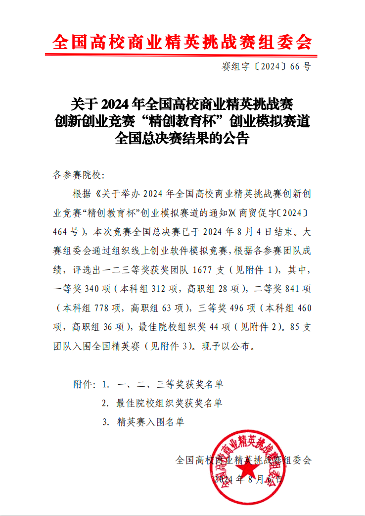 2024年全国高校商业精英挑战赛创新创业竞赛创业模拟赛道全国总决赛成绩日前公布,yl23411永利官网登录参赛团队斩获国赛一等奖1项,二等奖1项。