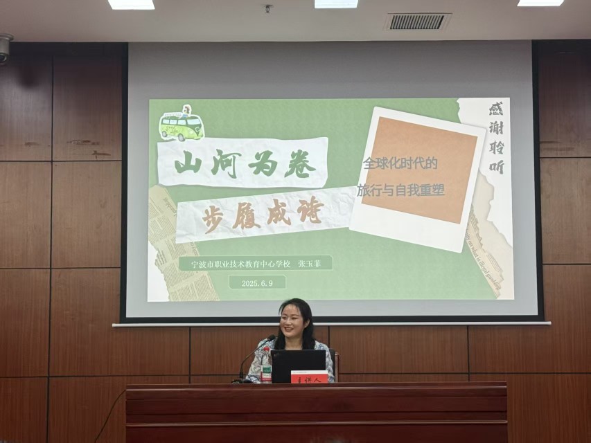 本次讲座邀请了宁波市职业技术教育中心公司正高级讲师、宁波市政协委员张玉菲老师担任主讲。张玉菲老师从“开篇”、“文化解码”、“自我重塑”、“终章”四个部分入手,以“山河为卷,步履成诗”为主题,带领在场师生深入探索全球化时代的旅游与自我重塑。张老师以“做自己的徐霞客”为引,引导同学们把旅行当作课堂,从世间百态中找寻灵感,做生活的智者。“在菲律宾感受人性的淳朴与善良,在冰岛荒原的孤独中直面内心恐惧,在希腊的日落下见证异国人汹涌热烈的爱意……”在讲座的现场,张老师以他那富有感染力的声音,娓娓道来他的所见所闻、所感所悟。一张张照片,不仅仅是个人经历的记录,更为我们打开了全球艺术解码与文化碰撞的大门。她讲述着每一个场景背后的历史渊源、文化背景,以及那些令人动容的人文故事,让听众在视觉享受的同时,也获得了心灵的触动和思想的启迪,让听众在轻松愉快的氛围中,收获了宝贵的知识和见解。