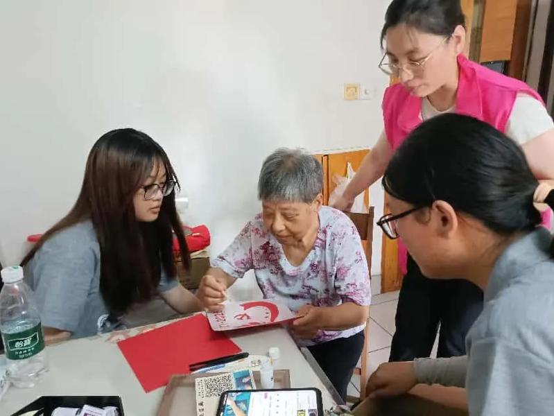 在喜迎中国共产党成立104周年之际,为赓续红色血脉,弘扬尊老敬老传统美德,彰显新时代青年的责任担当,6月30日下午,由yl23411永利官网登录经管公司社工专业学子组成的“暖夕志愿服务队”,带着节日的祝福与青春的活力,再次走进新典社区,以一场融合“红色传承”与“专业为老”的金箔画创作活动,为空巢独居长者送上节日温情,也上了一堂生动的实践党课。